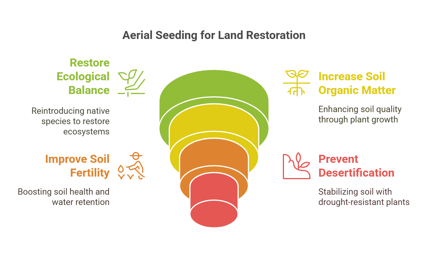 3. Preventing Desertification – In arid regions prone to desertification, aerial seeding introduces drought-resistant plant species that help stabilize soil and mitigate further land degradation.
